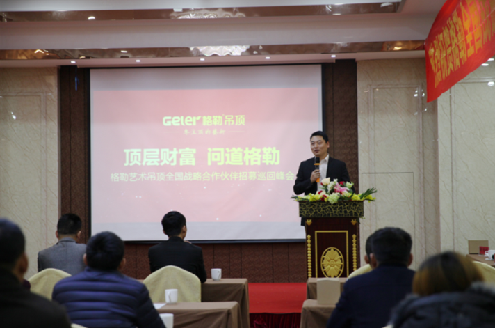 随后,格勒营销总监京总致辞,京总首先对目前集成吊顶行业进行了分析,同时对格勒前瞻性的管理思维与战略定位,以及对目前、短期、中长期格勒战略逻辑进行了阐释,为在场所有人勾勒出一个格勒吊顶未来的清晰轮廓。