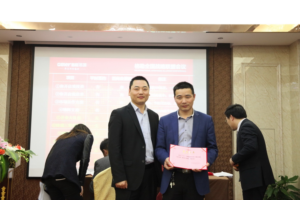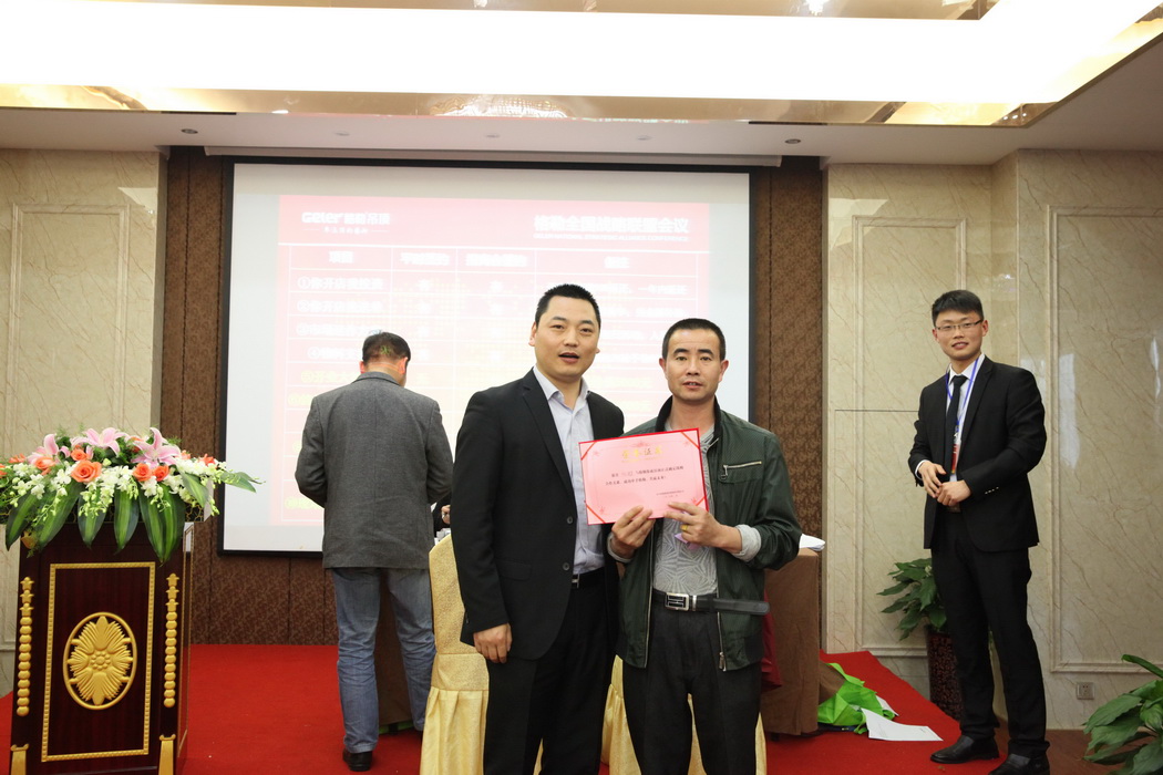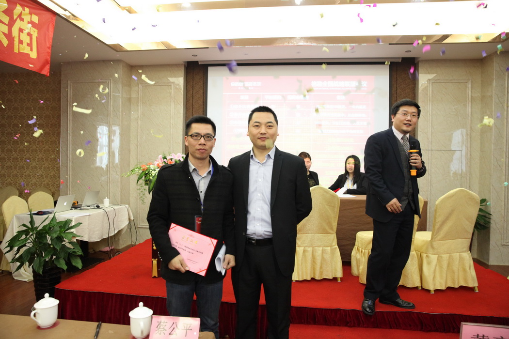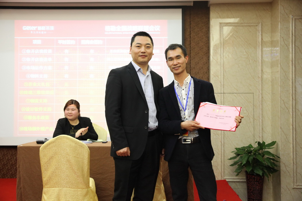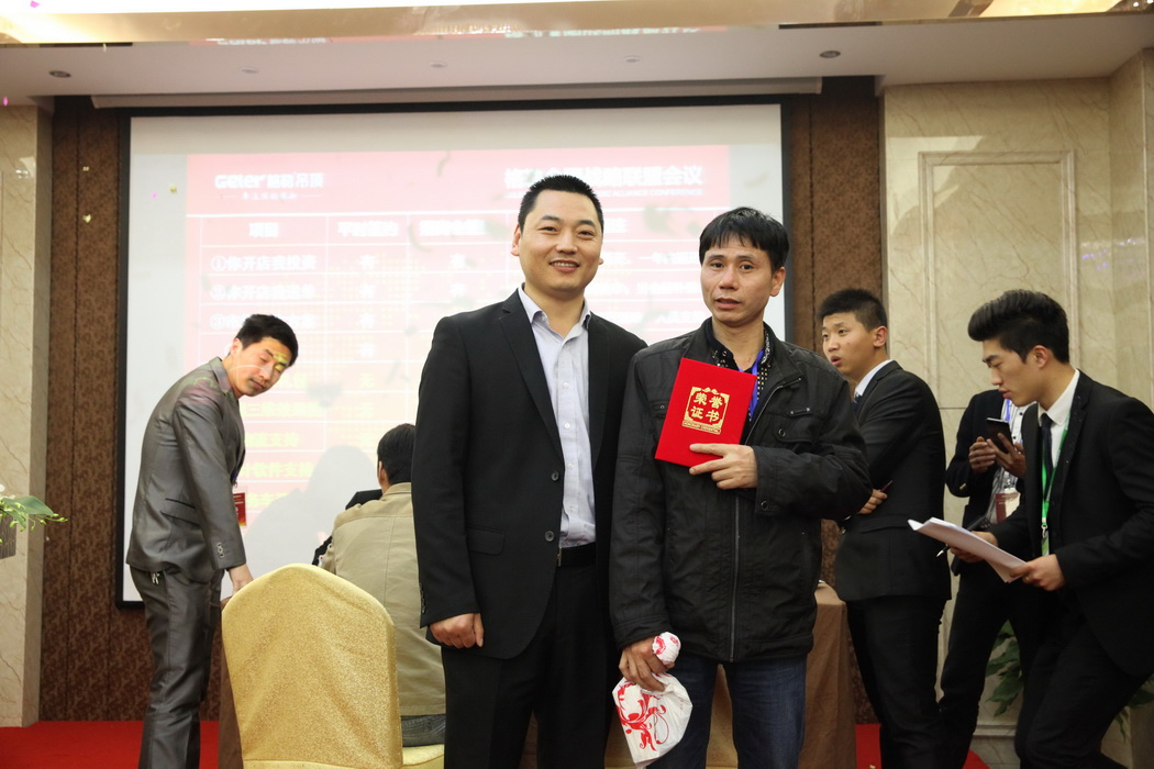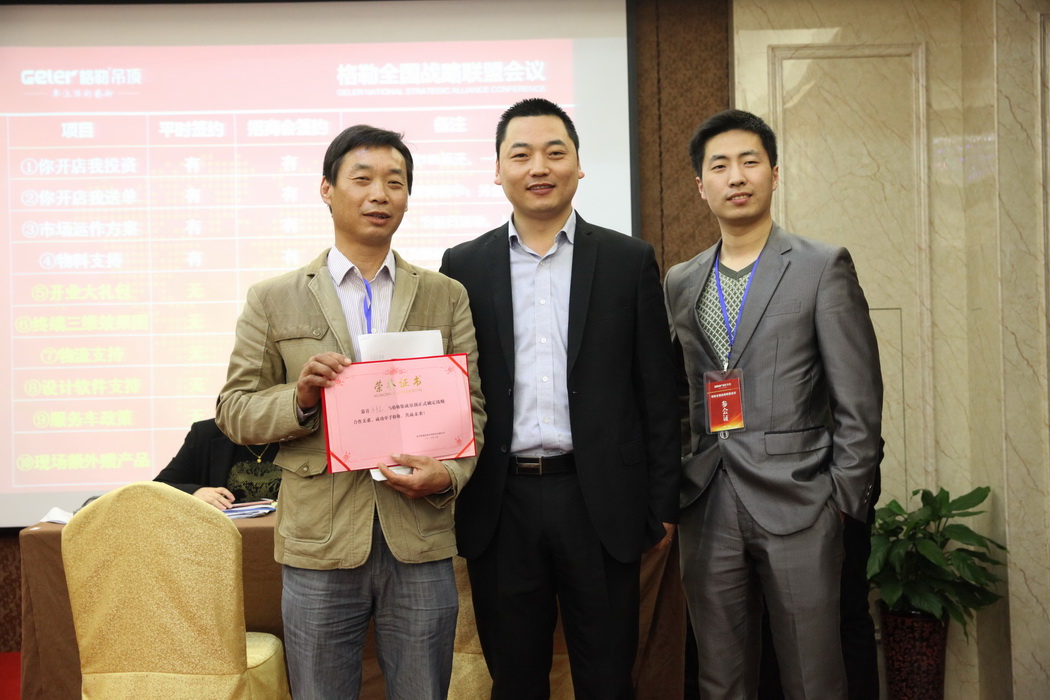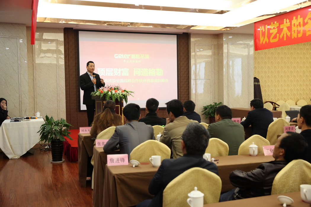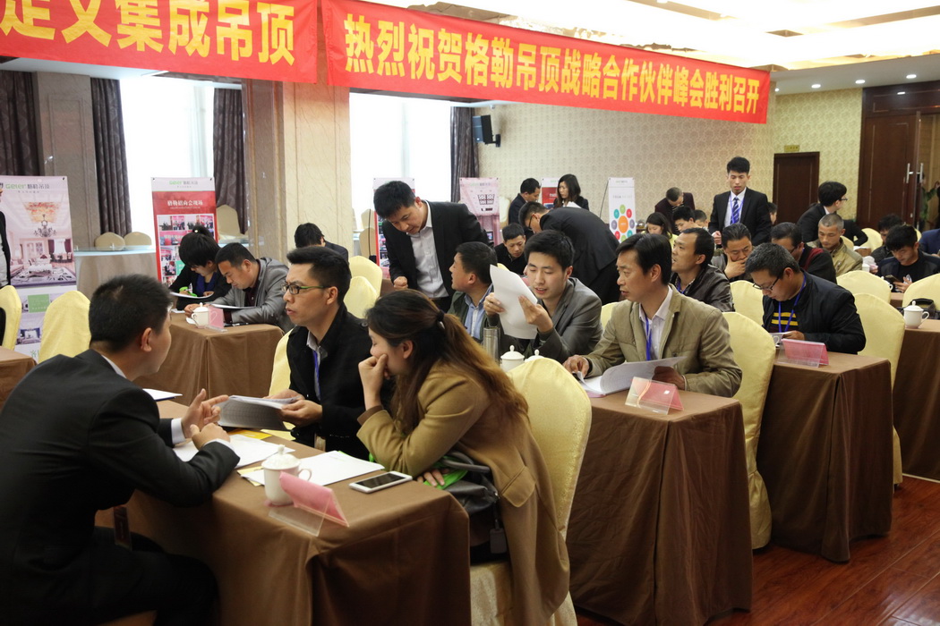 下午的招商会议于12:30准时在主持人的宣布声中拉开帷幕,首先是亚新平台总经理徐惠峰作大会开场致辞并分析了目前吊顶市场的概括,会上还详细介绍了格勒集成吊顶最新的三维软件和公司DRP系统,着重介绍了格勒天猫O2O战略,接着便是招商经理为参会人员介绍格勒吊顶对经销商的市场扶持和优势政策,为参会者细致地描述扶持政策,你开店我投资,你开业我送单。台下与会人员听后更是喜上眉梢,这无疑是让更多的加盟商看到加盟格勒的前景。各与会人员在对格勒有了一个整体的认识之后,接二连三上台与格勒签约,在音乐声中,贵州铜仁碧江、湖南郴州桂阳、安徽亳州谯城区江西上饶弋阳县、安徽淮南、江苏无锡宜兴、江苏常州武进区等地区与会人员与格勒真正成为相亲相爱的一家人,相信在未来的日子里定能勇攀财富的高峰!
