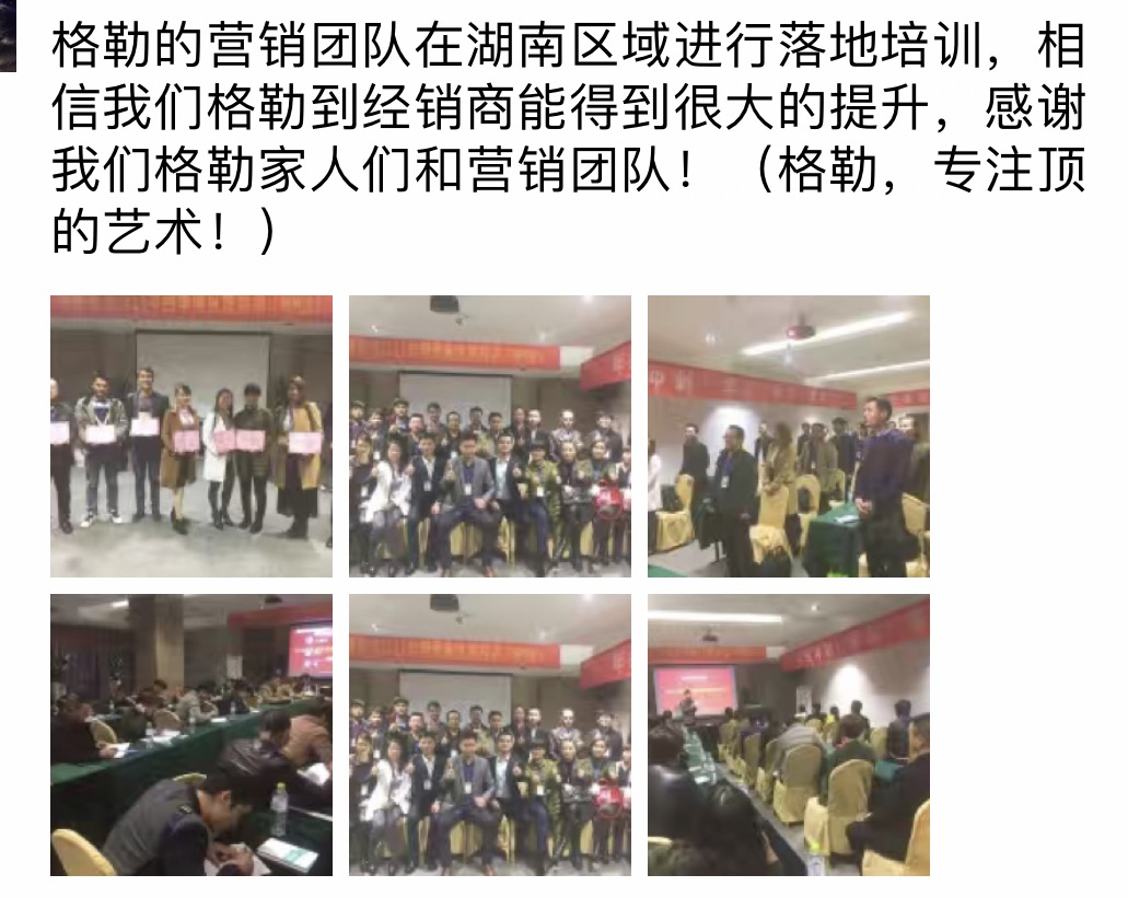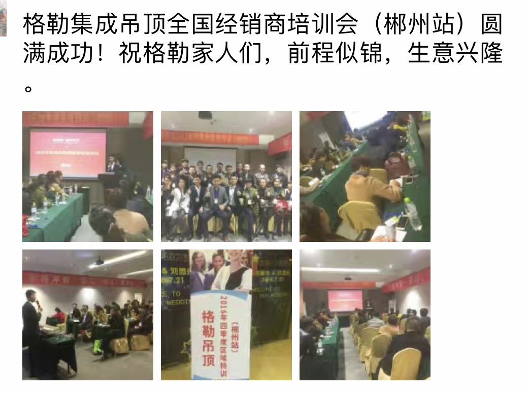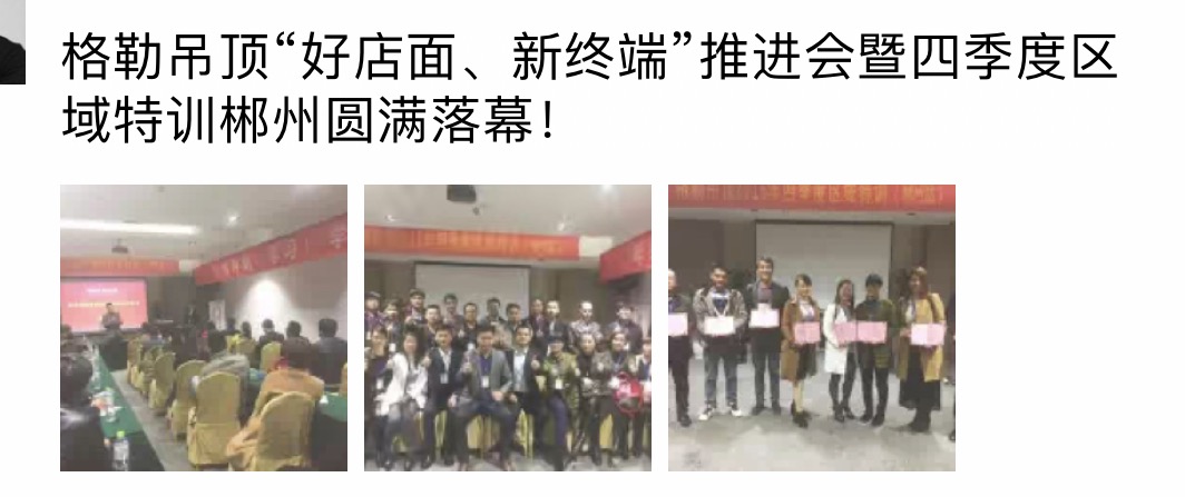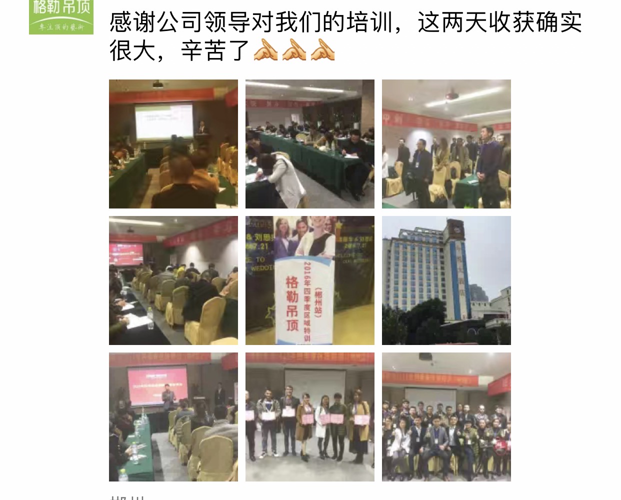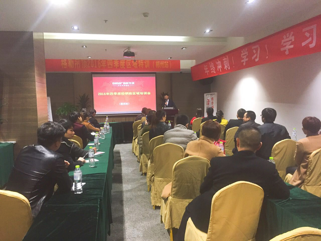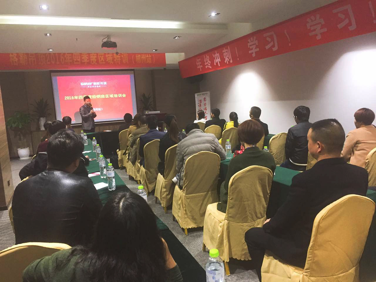 2016年格勒集成吊顶“好店面、新终端”推进会暨四季度区域特训会重庆站刚刚落幕, 11月15号,第四站在钟灵毓秀的福城湖南郴州今悦大酒店拉开序幕,来自湖南、湖北、广西等地区的格勒家人参加了本次培训会,针对公司产品、市场营销、互联网营销等进行了系统的学习。