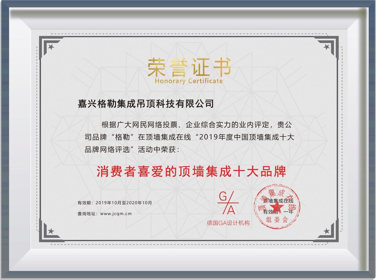 ► 10月14日,依据市场影响力和消费者口碑,在公平、公正、透明的评选机制下,由权威机构德国GA设计机构及顶墙集成在线主办的2019年度“消费者喜爱的顶墙集成十大品牌”品牌评选结果正式揭晓。授予格勒品牌2019年度“消费者喜爱的顶墙集成十大品牌”的荣誉 。
