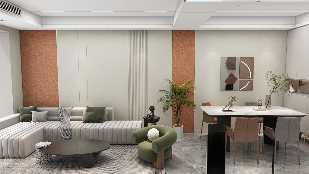 格勒蜂窝大板不同于一般吊顶的单调寡淡,以现代简约的设计给客餐厅空间带来温馨与时尚感。